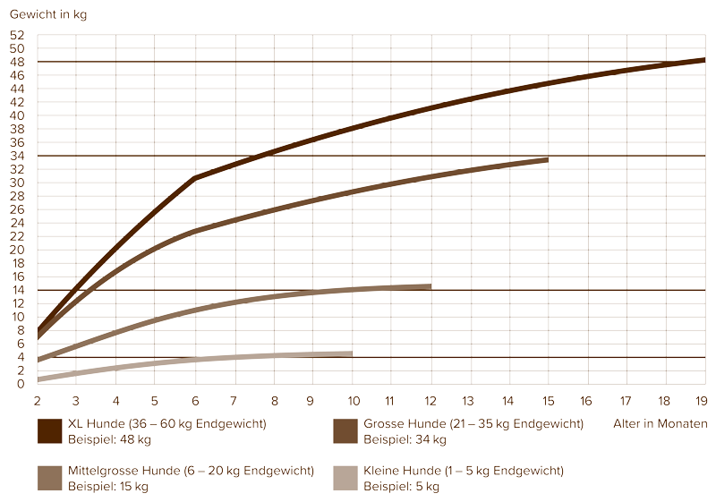 Wechsle erst dann zu Hundefutter für erwachsene Vierbeiner, wenn dein Hund ausgewachsen ist. Kleine Rassen sind mit ca. 10 Monaten, mittlere Rassen mit 12 Monaten ausgewachsen. Grosse Rassen und Riesenrassen sind erst mit 18 bis 24 Monaten ausgewachsen, je nach Rasse und Körperbau. Im ersten halben Jahr findet die grösste Gewichts- und Grössenzunahme statt. Detailliertere Informationen zu den Wachstumsphasen des Junghundes erhältst du bei deiner Züchterin, deinem Züchter oder dem Rasseverband.